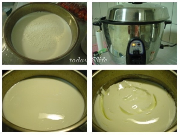 *我在我媽家 (只有傳統的大同電鍋) 有用這個方法做過,還是做得出來,不過製作的時間會接長,我通常是睡前弄,等到睡醒再去看一下成品,如果還未成形(仍未固化)可以再次提高一下電鍋的溫度,但記得不要過熱。
